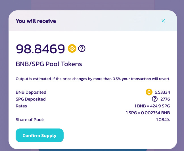 The 98.9468 in the picture is the is the amount of SPG-BNB-LP Token you will receive, Click confirm Supply and confirm again in the metamask wallet.